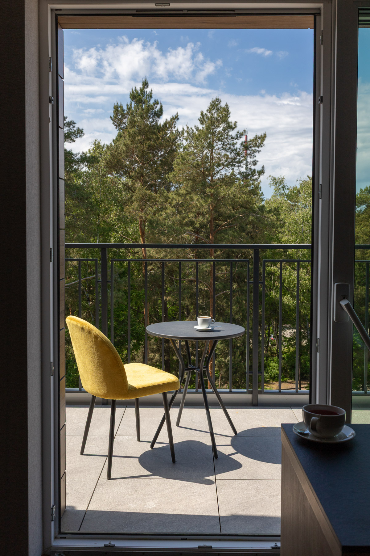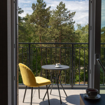 Większość pokoi posiada balkon lub taras, z którego można cieszyć się kojącym widokiem na otaczającą przyrodę – od lasu po spokojne wody Zalewu.