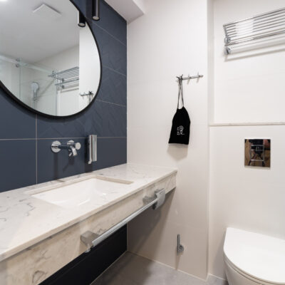 w łazience: suszarka do włosów i miękkie ręczniki.